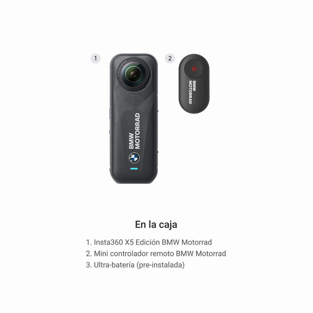 La Insta360 X5 BMW Motorrad Edition es la versión oficial para moto de la X5: edición limitada con branding BMW Motorrad, mini control remoto exclusivo y Ultra Battery de larga duración. Captura tus rutas en 8K 360º, con más autonomía y funciones pensadas para riders.